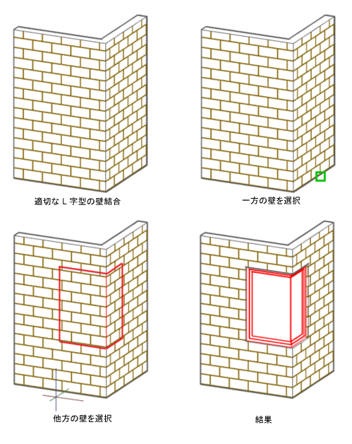 | 壁内のコーナー窓 | 適切な L 字型の壁結合を選択します。2 番目の壁に沿って挿入点を指定します。 |