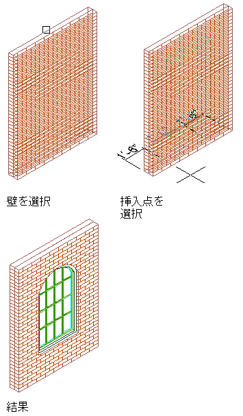 | 壁内の窓 | 壁を選択し、壁に沿って挿入点を指定します。 |