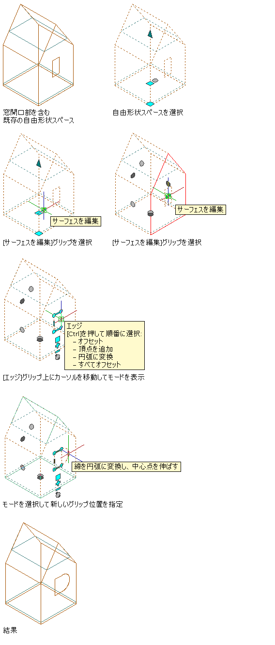 3D 自由形状スペース サーフェス上の開口部は、AutoCAD Architecture 2027 toolset の他の輪郭ベースの境界と同様に編集することができます。開口部の境界には、目的の形状を生成するための頂点グリップとエッジ グリップがあります。