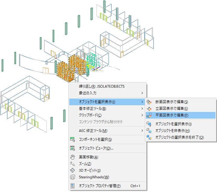 図面内でオブジェクトの選択を指定し、それらのオブジェクトを一時的な断面ビュー、立面ビュー、またはプラン ビューで編集できます。UCS を編集するときには、UCS は一時ビューに位置合わせされます。