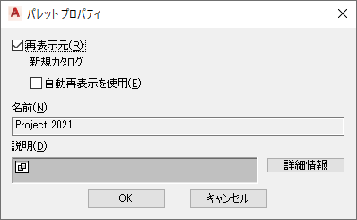 [自動再表示を使用]を選択すると、ソフトウェアを起動するたびに、リンクされたツール パレットが更新され、ツール カタログのツール パレットやその内容に行った変更が反映されます。