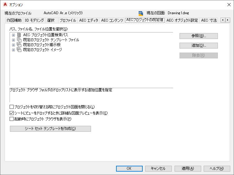 現在の図面に既定の AEC プロジェクトの既定値オプションを指定する