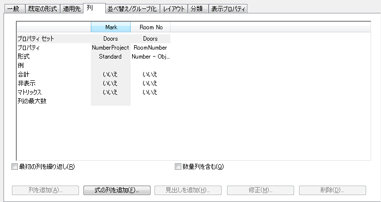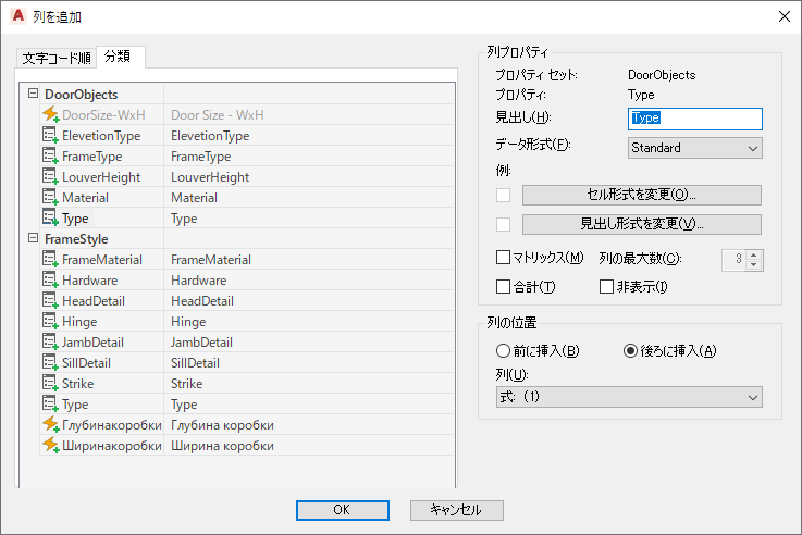 各列には、プロパティ セット内の 1 つのプロパティの値が入ります。 指定するプロパティのプロパティ セット定義が図面に存在しないと、プロパティの列を作成できません。
