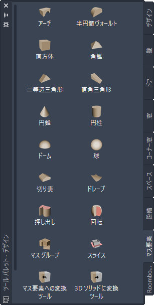 ワークスペースの既定のツール パレットには、マス要素ツールが用意されています。そのまま使用することもできますが、必要に応じてカスタマイズすることもできます。さらに、ソフトウェアに付属している次のカタログには、ツール パレットに追加できるマス要素ツールが登録されています。