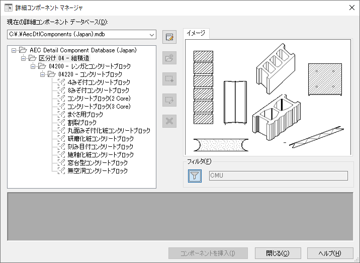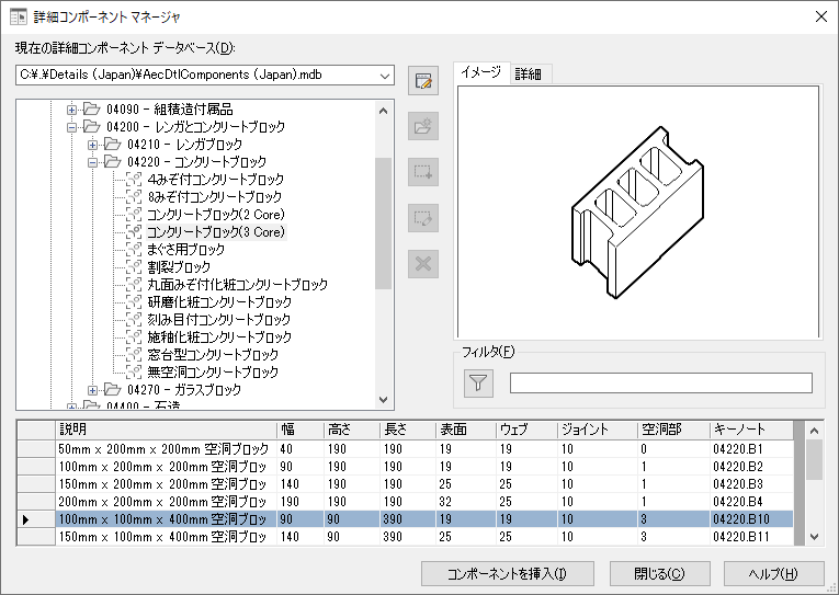 コンクリート組積造の表が表示された[詳細コンポーネント マネージャ]ダイアログ ボックス