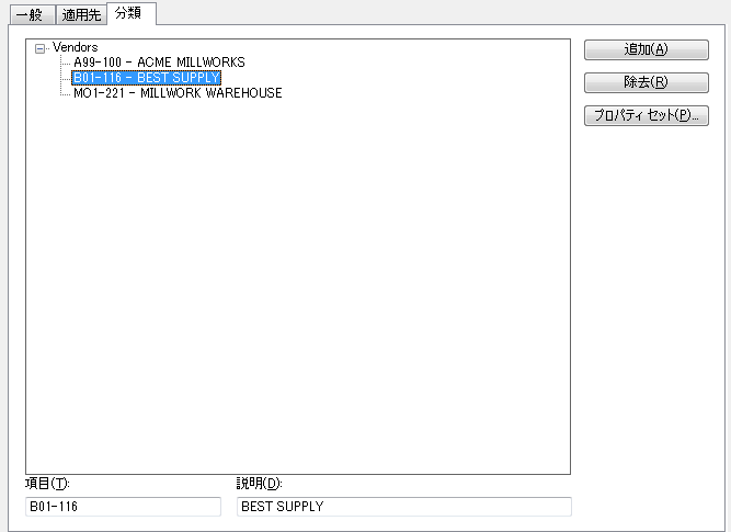たとえば、ベンダーの分類定義を作成した場合は、プロパティ セットを各ベンダー分類にアタッチすることができます。 プロパティ セットには、ベンダー固有の部品番号など、指定した任意のプロパティを含めることができます。 その後、これらのプロパティは、分類が適用される各オブジェクトに関連付けられます。これらのプロパティは、オブジェクトを集計するときに集計表に組み込むことができます。