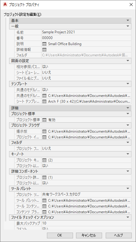 | 既定の AutoCAD Architecture 2027 toolset テンプレート プロジェクトをベースとする新しいプロジェクト | ¥<プロジェクト名>¥Standards¥ WorkspaceToolPalettes¥ <プロジェクト名>.atc の下にある新しい ATC ファイルを指定する 既定では、空のツール パレットが 1 つ ATC に挿入されています。 |
