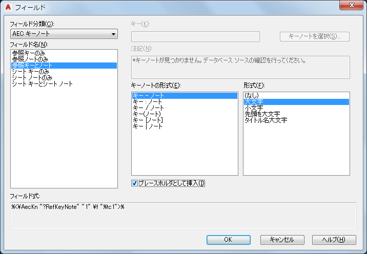 . [参照を編集]ダイアログ ボックスで、[OK]をクリックします。記号の KEY タグをダブルクリックして[属性定義の編集]ダイアログ ボックスを開いて、既定値をダブルクリックします。値が更新可能なフィールドでない場合は、右クリックして[フィールドを挿入]をクリックします。 |