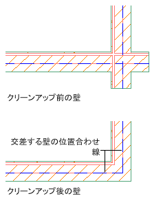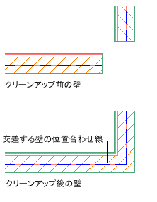 - 交差しない壁セグメントは延長されて、交差する壁の位置合わせ線を持つクリーンなコーナー状態で接続します。