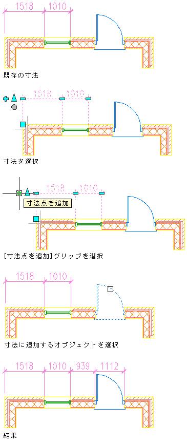 選択したオブジェクトに対するスタイルで指定されているすべての寸法点が、AEC 寸法のチェーンに追加されます。