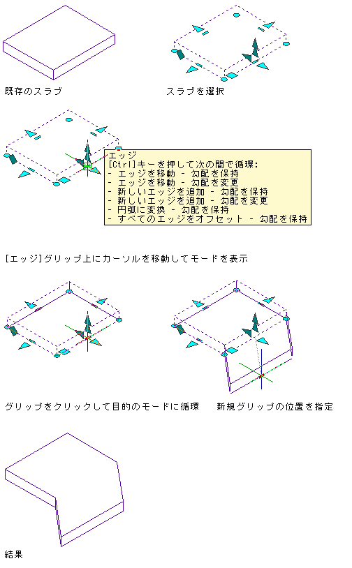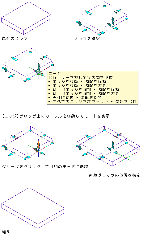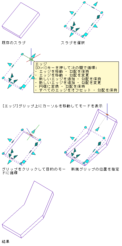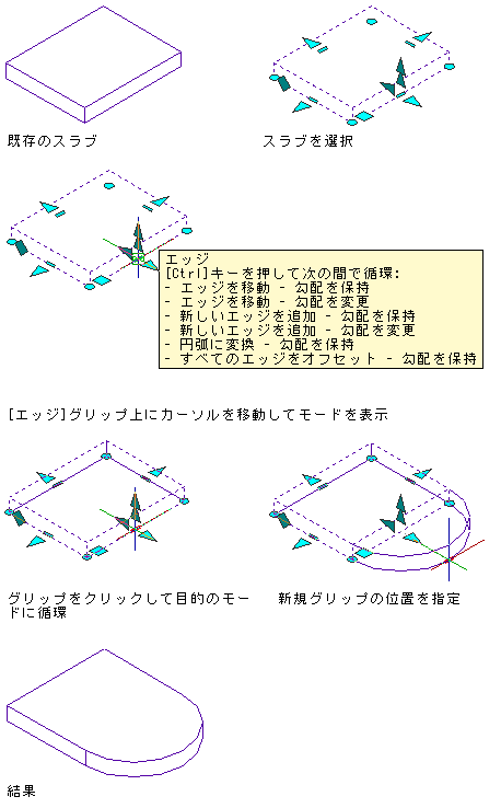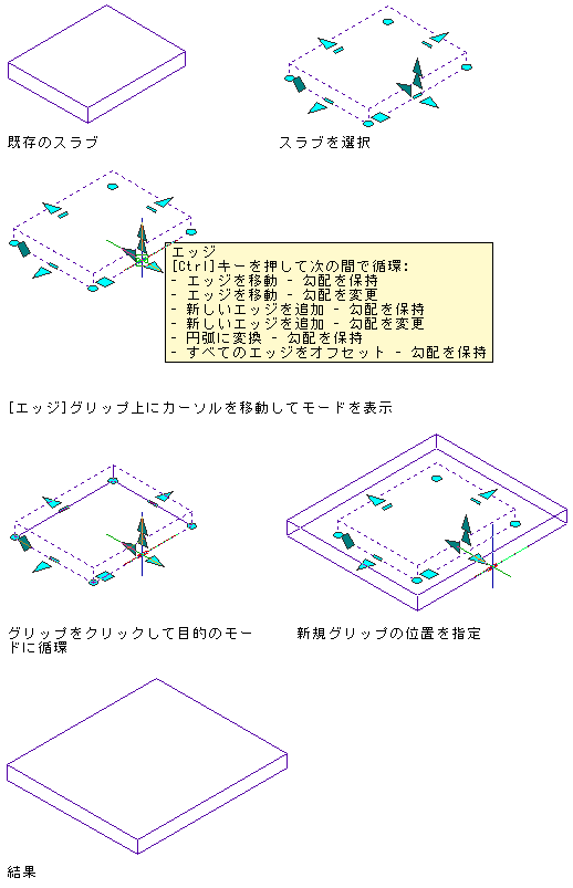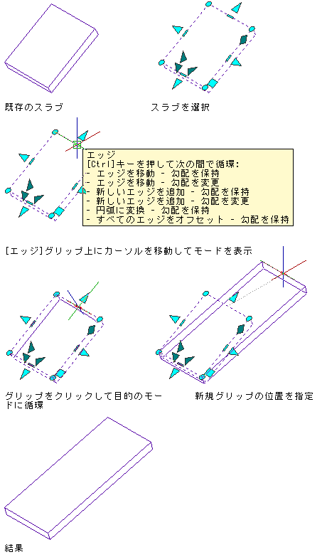エッジ グリップを使用すると、一度に 1 つのエッジを動かすことで、選択したスラブまたは屋根スラブのサイズ、形状、勾配を変更することができます。エッジ グリップの上にカーソルを移動すると、ツールチップに使用可能な編集モードの一覧が表示されます(手順の後に示すモードの説明を参照してください)。エッジ グリップをクリックした後、[Ctrl]を押すことでモードを切り替えることができます。