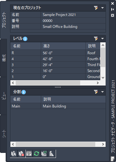 プロジェクト ナビゲータ パレットは、AutoCAD Architecture 2027 toolset のプロジェクト ファイルを作成、修正、参照する上で、中心的な役割を果たします。プロジェクト ナビゲータ パレットは通常、特定のプロジェクトで作業している間はワークスペース内で開いておきます。
