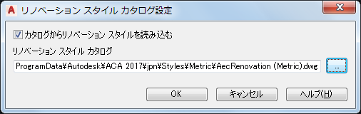 既定で、リノベーション スタイル カタログ(AecRenovation.dwg)は ProgramData¥Autodesk¥ACA <バージョン>¥jpn¥Styles にインストールされます。リノベーション スタイル カタログが名前変更または移動されると、スタイルが無効になり、アクセスできなくなります。[リノベーション スタイル カタログ設定]ダイアログ ボックスを使用して、有効なカタログを指定します。