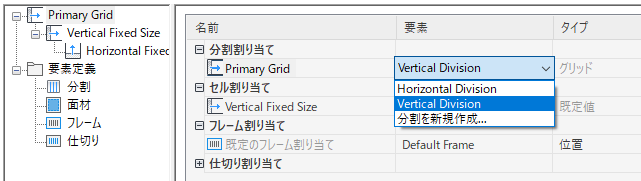 分割により、グリッドの方向(グリッド セルとマリオンの方向: 水平または垂直)と、分割タイプ(セルの数とサイズ)が定義されます。
