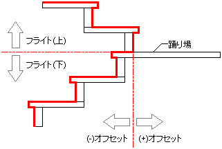 [踏み板から踏み板]、[踏み板から蹴込み]、[蹴込みから蹴込み]を選択したときは、オフセット値を指定することができます。正のオフセット値を指定すると、下側の一続き階段の踏み板の位置が上側の一続き階段の踏み板の位置よりも踊り場に近くなります。