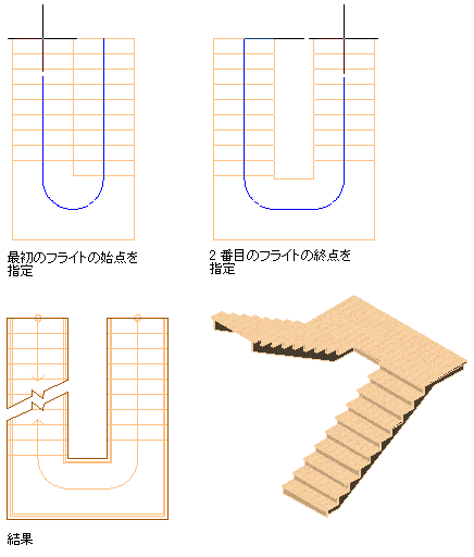 | 階段が反対方向に曲がる場所に階段を作成し、一続き階段全体に踏み板を配置するには | [ターンのタイプ]で[1/2 ターン]を選択します。 |