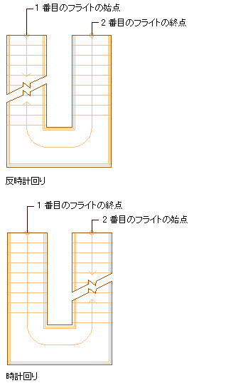 | 左側が階段の外側のエッジで、右側が内側のエッジになるように、U 字形階段を描くには | [水平方向]で[時計回り]を選択します。 |