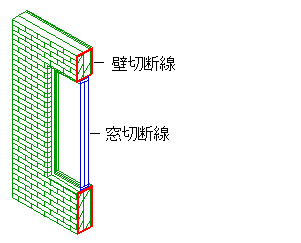 たとえば、窓の付いたレンガ壁を切断する場合に、定義線分に同じ色を指定することもできますが、断面線分が切断するオブジェクト(壁または窓)に応じて色を変えることもできます。 定義線分コンポーネントに同じ色を使用する場合は、マテリアルのプロパティを使用せずに、コンポーネントに色を割り当てます。 定義線分の色が断面図内のオブジェクトに応じて変わるようにする場合は、マテリアル プロパティを使用します。 窓の付いた壁を横切る断面図の場合は、壁を切断する定義線分に赤を使用し、窓を切断する定義線分に青を使用します。