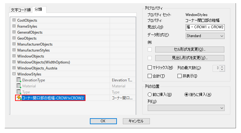 [列を追加]ダイアログ ボックスの[窓スタイル]領域で[コーナー開口部の粗幅 - CROW1 x CROW2]を選択します。