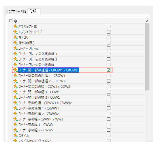 [窓スタイル]領域で、[コーナー開口部の粗幅 - CROW1 x CROW2]を選択します。