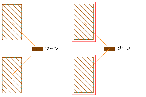 オフセットが 0 のゾーン境界(左)と、あるオフセット値のゾーン境界(右)