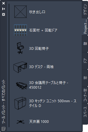 AutoCAD Architecture 2027 toolset のツール カタログ項目を使用するには、項目をソフトウェアのワークスペースにドラッグします。ツール パレットをワークスペースにドラッグすると、そのツール パレットが既定のツール パレット セットに追加されます。
