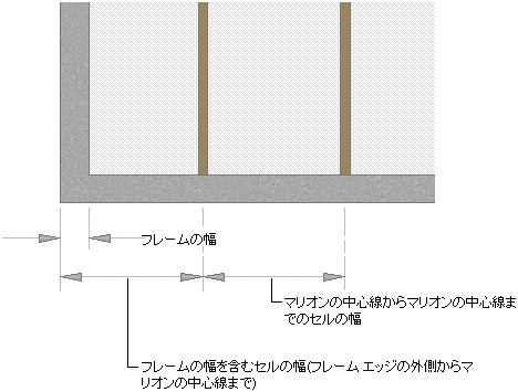 既定では、グリッド セルは、組合せ窓の基準線の始点と終点から計測されるか(水平分割の場合)、基準線から基準高さまでで計測されます(垂直分割の場合)。セルのサイズの計算に、グリッド フレームの幅は考慮されません。たとえば、14 フィートの基準線と左右 1 フィートのフレームを使用して組合せ窓を作成し、固定数の垂直セルを指定した場合、垂直セルは同じサイズで表示されません。最初と最後のセルにはフレームが含まれているので、これらのセルは小さくなります。