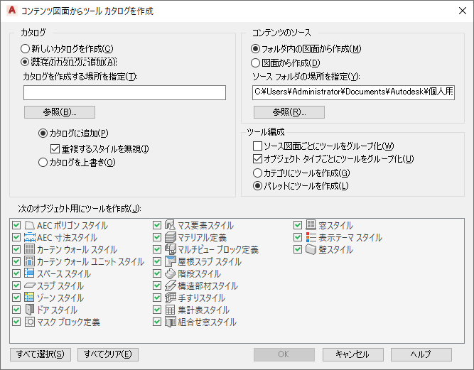 注: 両方のオプションが有効にされると、ツールは初めに図面ごとに、次いでオブジェクト タイプごとにグループ化され、カタログは図面から、パレットはオブジェクト タイプから生成されます。パレットはネストできないため、このように実装されます。この場合、下のラジオ ボタンは無効になり、[パレットにツールを作成]オプションはツール用に選択されます。