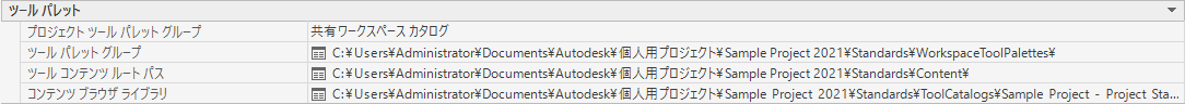[共有ワークスペース カタログ]を選択すると、[ツール パレット グループ]で選択したパスは、プロジェクト プロファイル(AWS)に追加され、ツール カタログには、指定した位置からアクセスします。[ユーザ別のワークスペース カタログ]を選択すると、フォルダが C:¥My Documents¥Autodesk¥My Projects¥<プロジェクト名> に作成され、ツール パレットがそのフォルダにコピーされます。[なし]を選択すると、そのプロジェクトに対してプロジェクト ツール パレット グループは無効になり、[ツール パレット]の下に他のプロパティは表示されません。