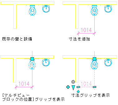 AEC 寸法ツールでは、[点を指定(P)]オプションを使用することで、AEC オブジェクト上の基点と OSNAP 点を選択して、自動調整寸法を作成できます。さらに、選択した点からのオフセットを定義することで、オブジェクト上のほとんどすべての点の寸法を記入することができます。このオプションを使用すると、マルチビュー ブロックや 2D 建物断面図などのように AEC 寸法スタイルでは寸法点を設定できない AEC オブジェクト、または必要な寸法点をスタイルでは設定できないオブジェクトの、寸法を記入できます。たとえば、AEC 寸法スタイルでは壁にあるピラスタの位置の寸法を記入することはできませんが、壁で端点を選択した後、これがピラスタの位置に対する寸法点になるようにオフセットすることができます。