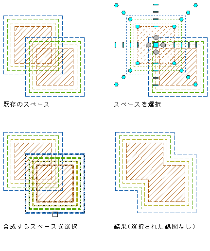手動境界オフセットが設定されたスペースを合成する場合は、最初のスペースのアクティブ化された境界が、他のスペースの対応する境界(基本境界と基本境界、ネット境界とネット境界など)にそれぞれ合成されます。
