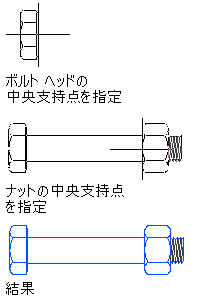 ボルトの頭とナットの間の距離を指定する必要があるボルト コンポーネントを挿入するには、以下の手順を実行します。この例では、[ビュー]プロパティが[側面]に設定されているボルトを挿入するツールを示します。[ヘッド]または[ナット]に設定した場合でも、最初の 2 つの手順についてのプロンプトは表示されません。