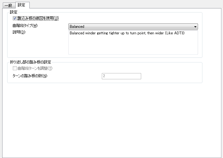 | [曲階段タイプ]で[単一点]を選択したときに使用する曲階段の数を設定するには | [曲階段ターンを調整]をオンにし、[ターンの踏み板の数]に値を入力します。 |