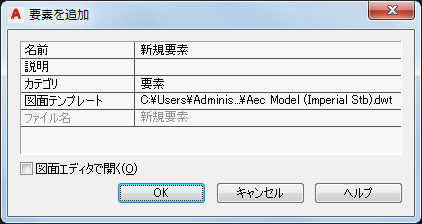 | 新しい要素に名前を付けるには | 名前を入力します。プロジェクト番号がプロジェクト ファイル名の接頭表記として使用される場合は、ここで接頭表記を入力する必要はありません。接頭表記が付いた正式な名前は、[ファイル名]の下に表示されます。 |
