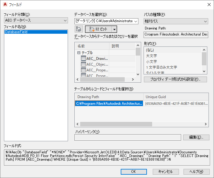 図面に挿入するデータベース フィールドを選択するには、次の手順を実行します。