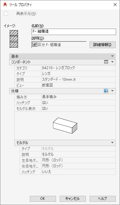 [ツール プロパティ]ワークシートの外観は、コンポーネントのタイプとプロパティ設定の現在の設定に応じて異なります。以下の図は、サンプルの基本ツール パレットに含まれる 04 - 組積造ツールのツール プロパティ ワークシートの 2 つの構成を示しています。いずれの場合でも、このツールは標準の 3/8” 継手レンガを追加するように設定されていますが、1 番目のものは設定で[ビュー]プロパティが[断面]に設定されており、2 番目はこのプロパティが[立面線図(パターン)]に設定されています。ビューによって異なる方向に配置できる詳細コンポーネントについては、[ビュー]設定によって、図面にイメージを挿入する方法が決まります。異なる[ビュー]設定では、ワークスペースで異なる方向を向いた図になることに注意してください。モルタル仕様は[立面線図(パターン)]設定には適用されず、したがってこの構成では表示されないことにも注意してください。[仕様]の下に表示されるプロパティは、設定に応じて異なることがあります。たとえば、[モルタルを表示]プロパティは、[ビュー]設定が[断面]の場合は[いいえ]になり、モルタル プロパティは表示されません。詳細コンポーネントの中には、仕様が適用されず、見出しが表示されないものもあります。
