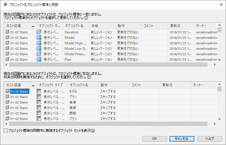 この場合は、「スタイルや表示設定を同期から除外するには」の説明に従って、[プロジェクト標準仕様の同期中に無視するオブジェクト セットを表示]を選択するか、スタイル マネージャまたは表示マネージャのスタイルや表示設定から[無視する]フラグを削除した場合を除き、矛盾するオブジェクトは将来の同期では再びリストされません。