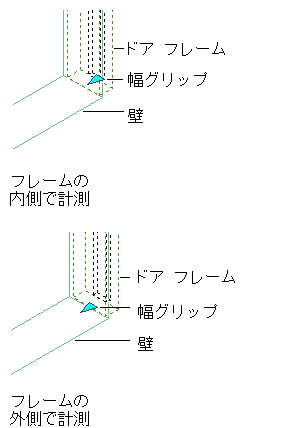| 計測範囲 | ドアの幅と高さが、ドア フレームの内部と外部のどちらに向かって計測されるかを指定します。ドアがフレームの外部に向かって計測される場合、フレームを差し引いた分だけ小さくなります。 図![]() |