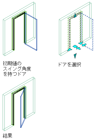 | スイング角度 | ドアが表示される開口部の角度を決定できます。 スイング角度と表示プロパティスイング角度は、ドア スタイルの表示プロパティでも決定できます。スタイルの設定がプロパティの設定より優先されます。 図![]() |