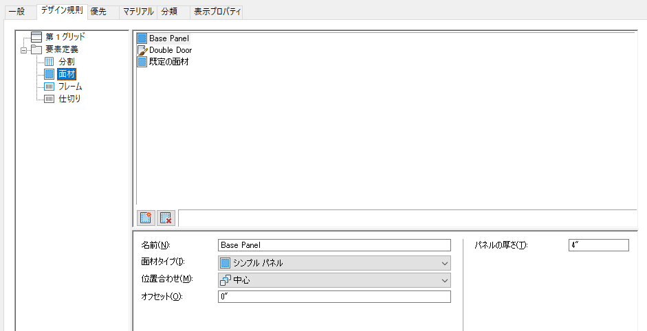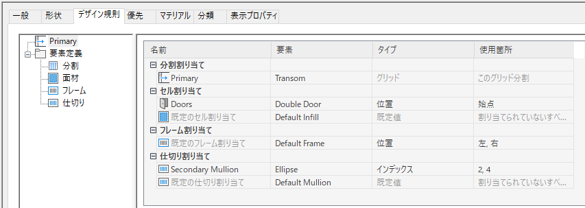 定義名の変更を含むすべての変更は、既存の定義に上書きされます。割り当て一覧から新しい定義を作成するには、[要素]リストから[新規作成]を選択します。定義一覧から新しい定義を作成するには、[分割を新規作成]アイコン、[面材を新規作成]アイコン、[フレームを新規作成]アイコン、または[マリオンを新規作成]アイコンをクリックします。