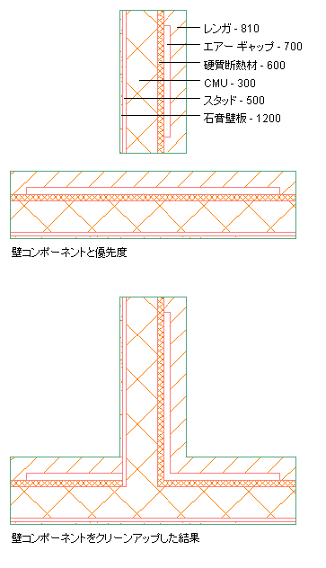 コンポーネントの優先度により、各壁コンポーネントを交差する壁のコンポーネントでクリーンアップする方法が決まります。 コンポーネント インデックス番号が小さいほど、コンポーネントが他の壁と交差するときの優先度が高くなります。