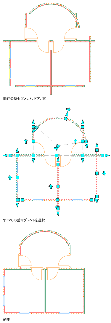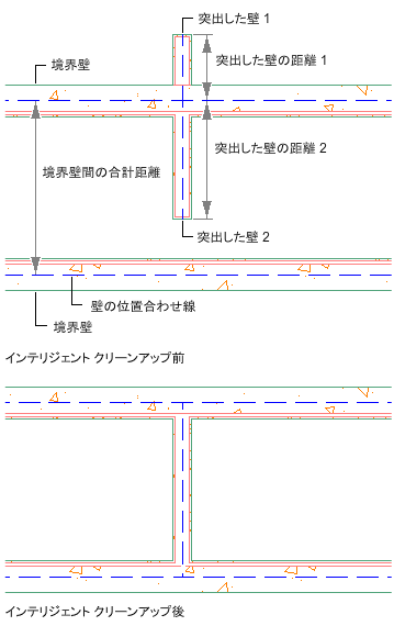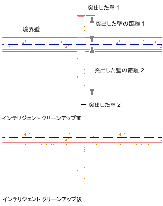 複数の壁の交差をクリーンアップする場合、突き出した壁はトリムされるか、境界の壁として機能する隣接した壁まで延長されます。選択された壁だけがクリーンアップに関与します。