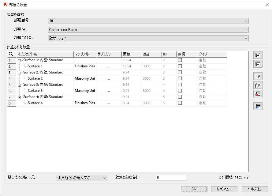 - 計算されたオブジェクトの名前です。計算された部屋の数量のオブジェクト名は、オブジェクト、カウンタ、スタイル名で構成されます。単一面の名前は、オブジェクト タイプ、面、カウンタで構成されます。
