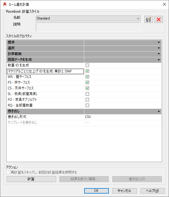 - [ルーム量を計算]ダイアログ ボックスで、[スタイルのプロパティ]領域の[図面データを生成]リストから、[マテリアルごとに仕上げ ID を生成]を選択します。