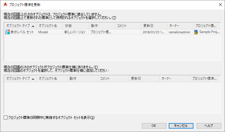 この場合は、プロジェクト標準図面のバージョンは、プロジェクト図面のバージョンで上書きされません。プロジェクト図面の次回の同期中に、この表示設定はプロジェクト標準仕様での同期外として表示されます。