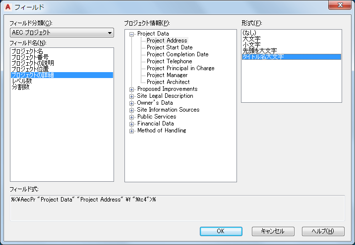 たとえば、プロジェクトの詳細を表示する場合、[フィールド分類]には[AEC プロジェクト]を選択し、[フィールド名]には[プロジェクトの詳細]を選択します。
