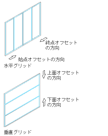 | カーテン ウォール基準線の始点から最初のセルの開始端までの距離を水平グリッドに指定するには | [始点オフセット]に値を入力します。 |