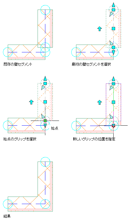 壁セグメントの位置合わせ線が相互に交差していないか、1 つの位置合わせ線が隣接するクリーンアップ円の中に収まらないためです。壁セグメントの位置合わせ線の端点が隣接する壁セグメントのクリーンアップ円の中に収まるように、壁セグメントの長さを調整します。