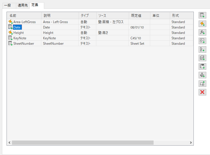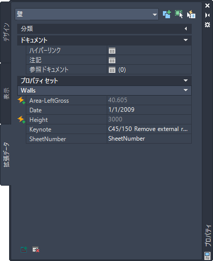 キーノート、日付、およびシート番号フィールドを備えた壁プロパティ