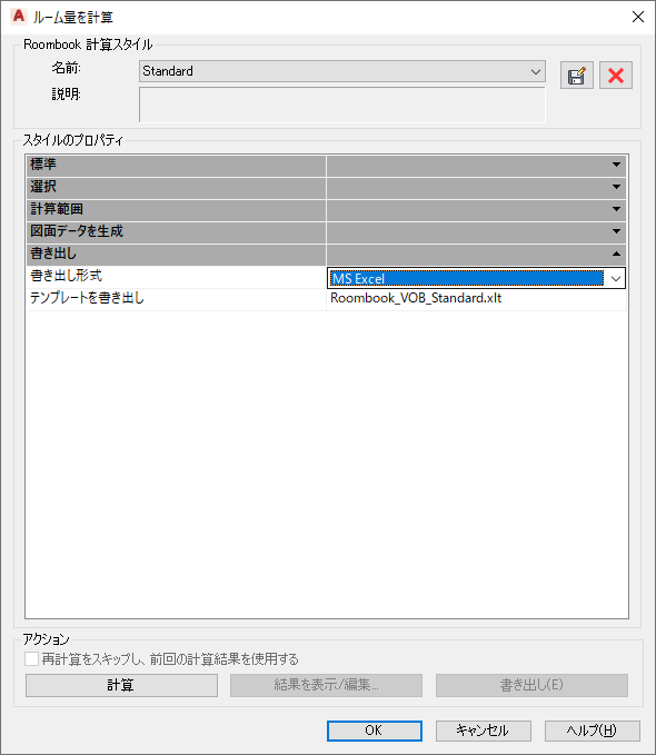 - [ルーム量を計算]ダイアログ ボックスで、[スタイルのプロパティ]領域の[書き出し]リストの[書き出し形式]リストから、[MS Excel]を選択します。